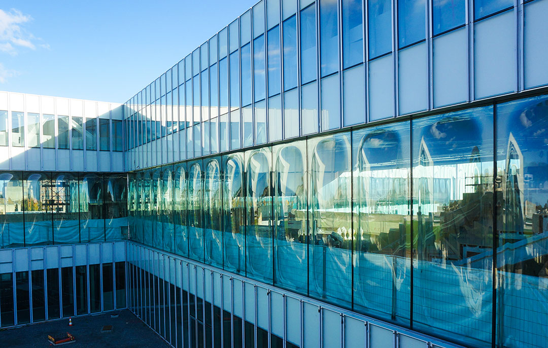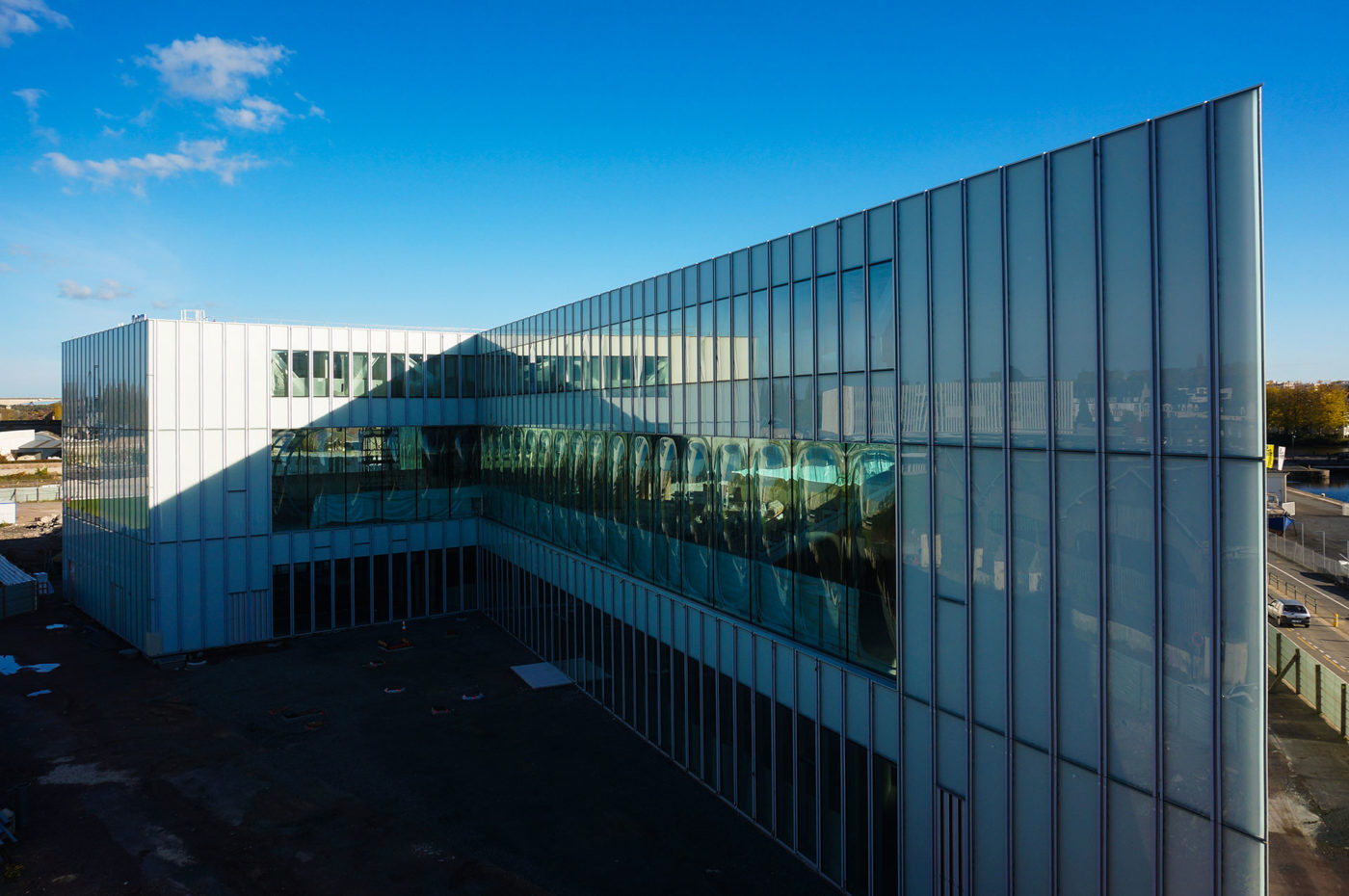 The facades are composed of opaque aluminium panels covered with a glass plate and translucent panels the outer glazing of which is curved. The latter, self-supporting, are six metres high. The urban landscape is reflected in it strangely as if in a distorting mirror.