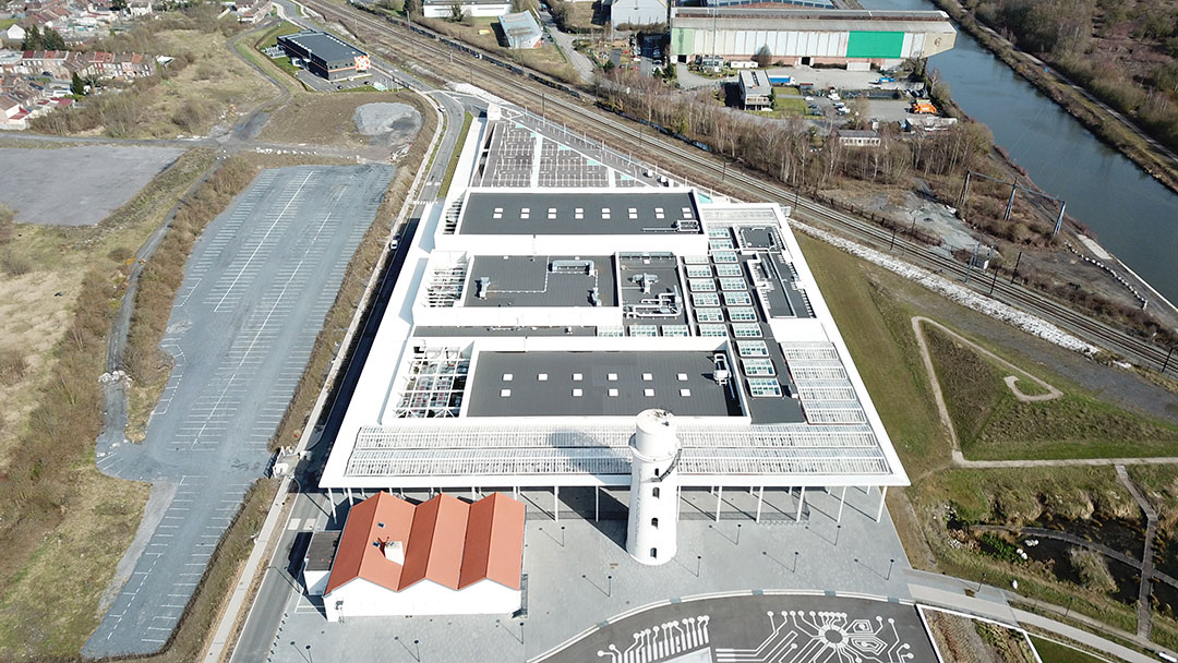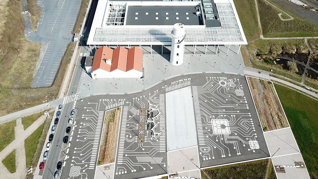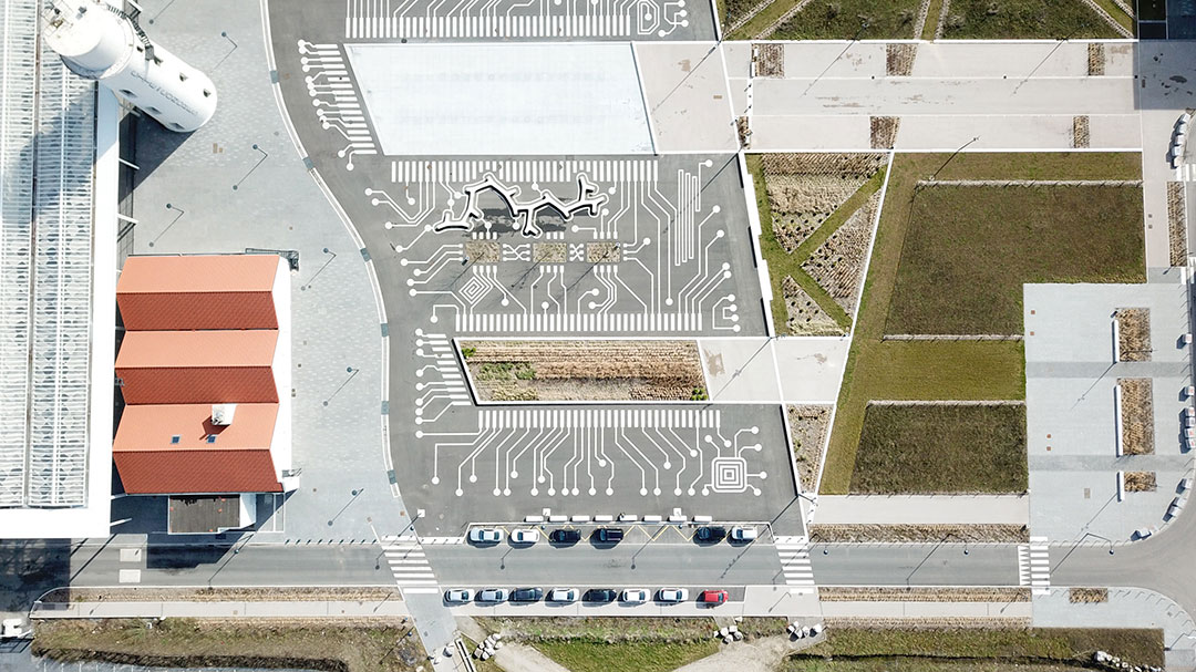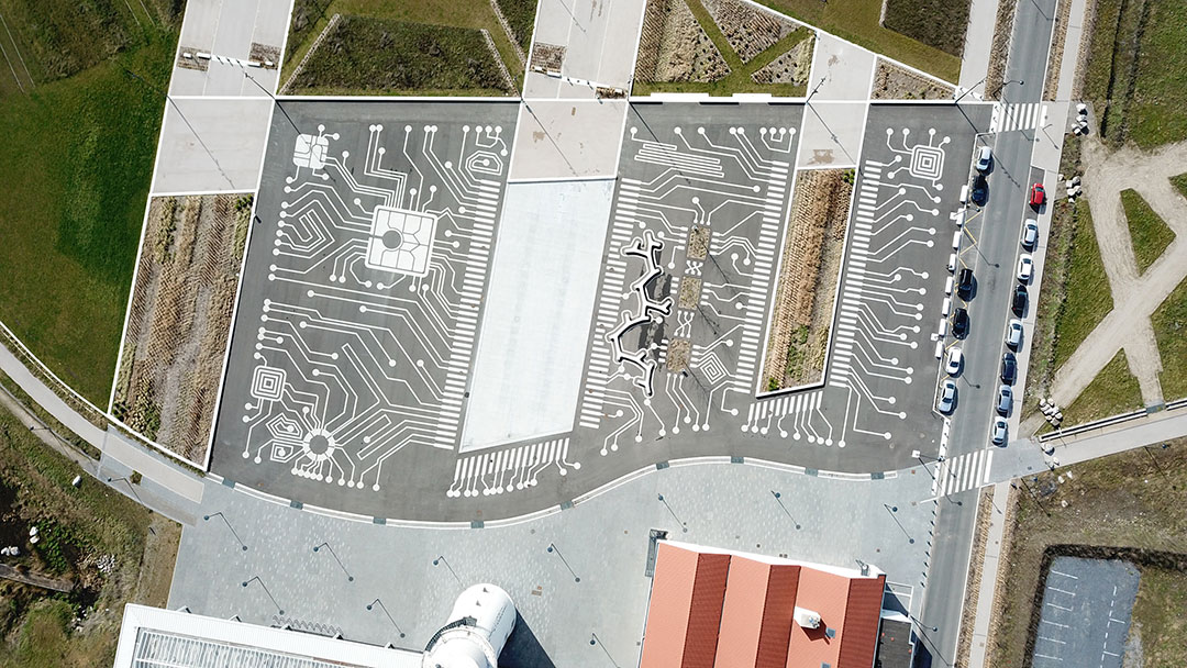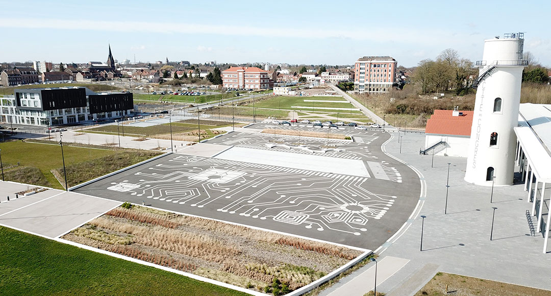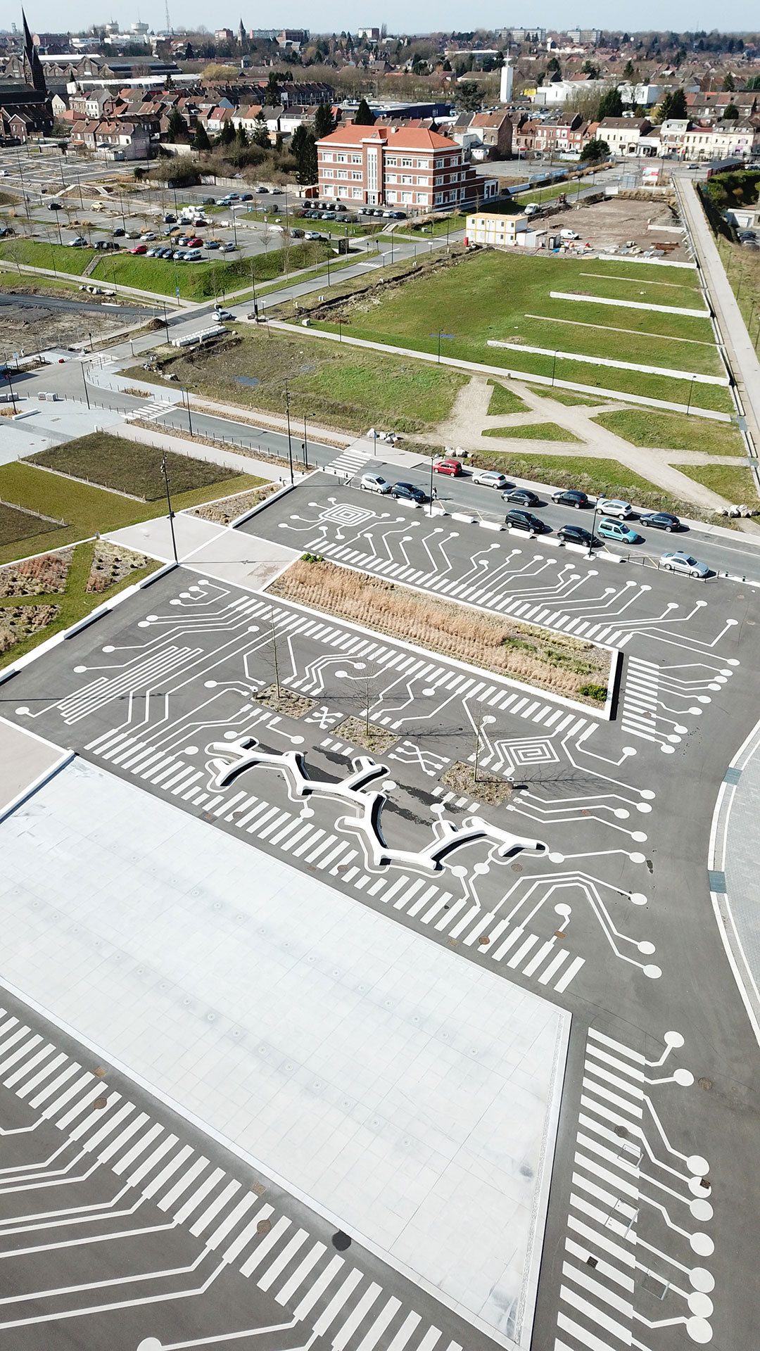 In reference to the business park of the creative banks of the Scheldt (centre of numerical and technological excellence), the esplanade, of 16,000m², is covered with a ground layout representing an electrical circuit. We can find a fountain of 450m² in the centre like a reflecting pool. LED projectors allow for modulation of effects and colour for night enhancement.