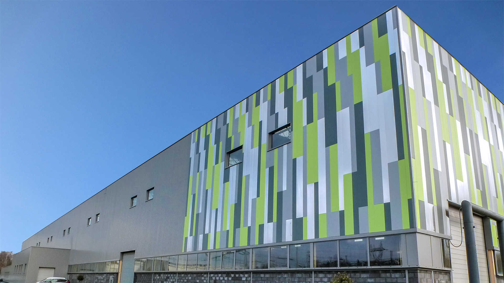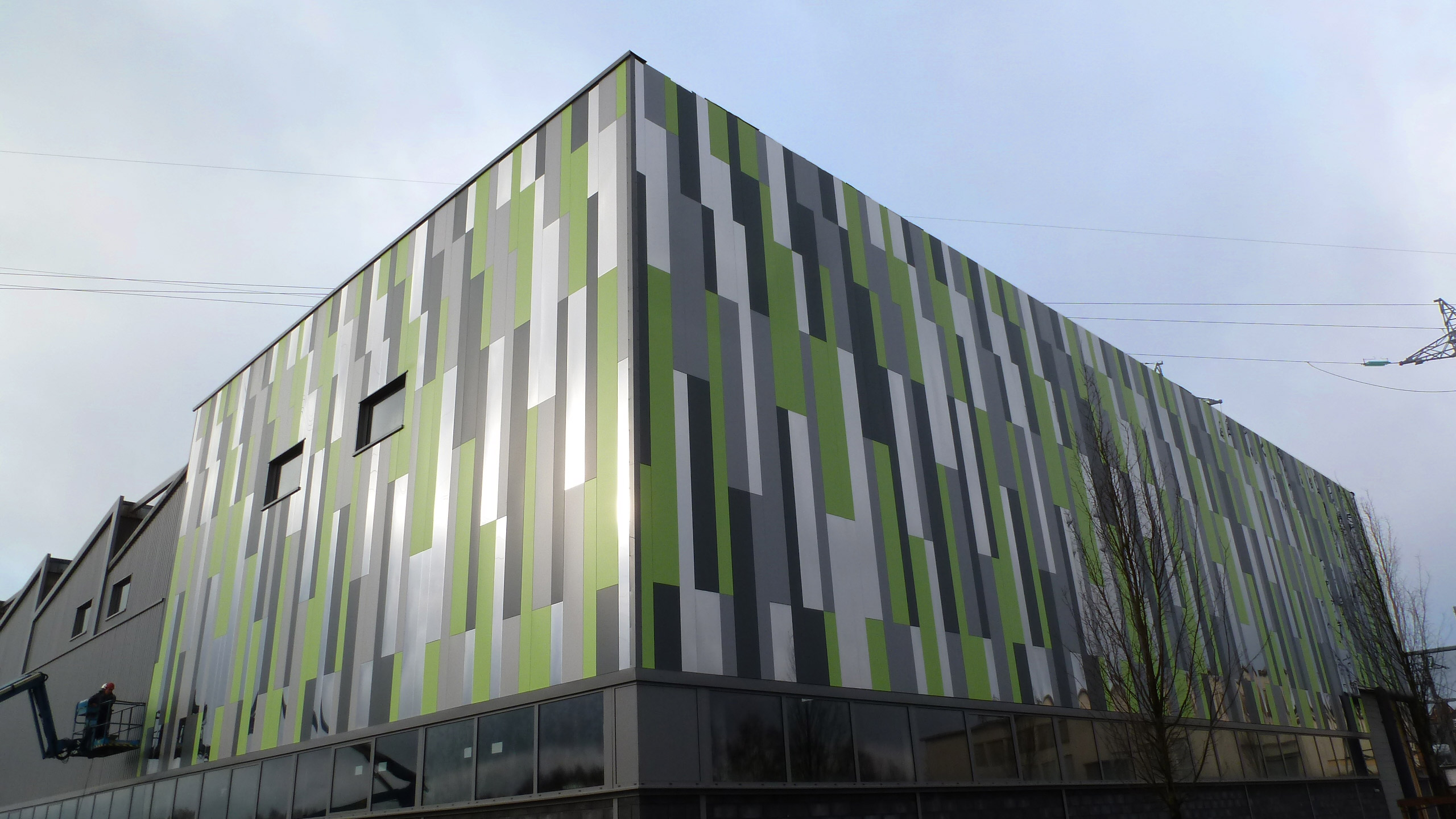 La réfection comprenait également la reprise d’étanchéité des bureaux, de certains chéneaux et le remplacement de 3 verrières. Le façonnage et le pliage du bardage a été fait dans les ateliers du groupe à Avesnelles. C’est plus de 3200m² de bardage qui ont été posés et 1200m² de cassettes colorées placés en patchwork à la tête du bâtiment.